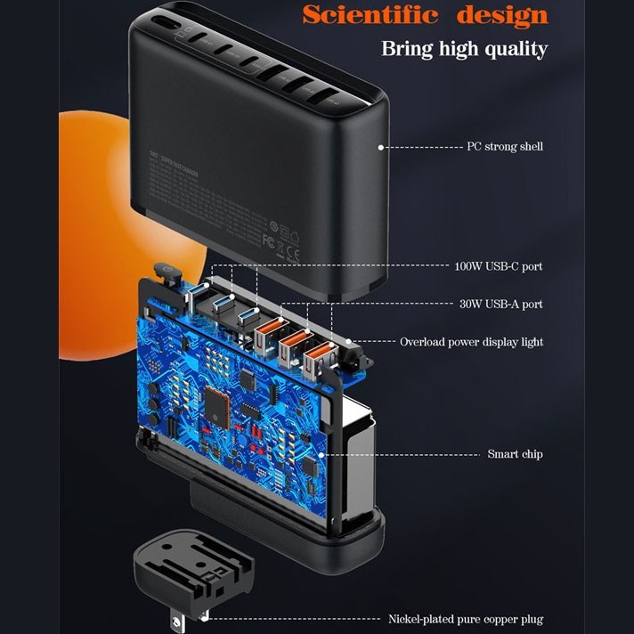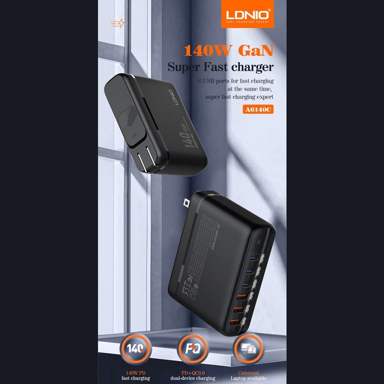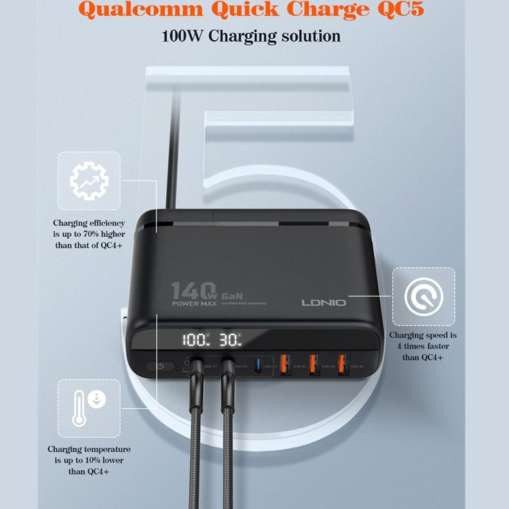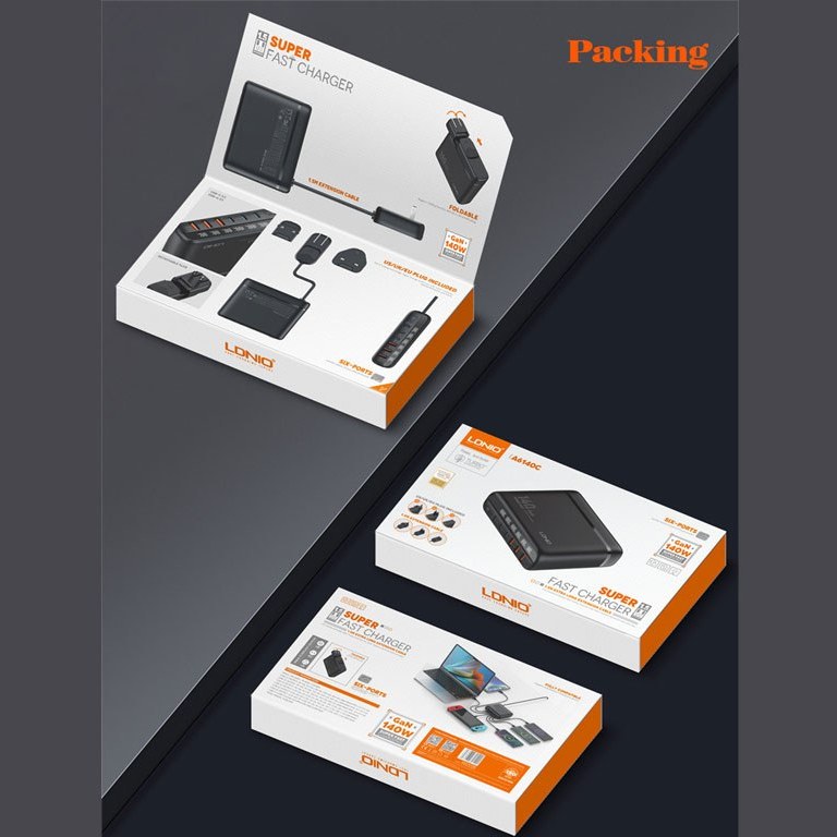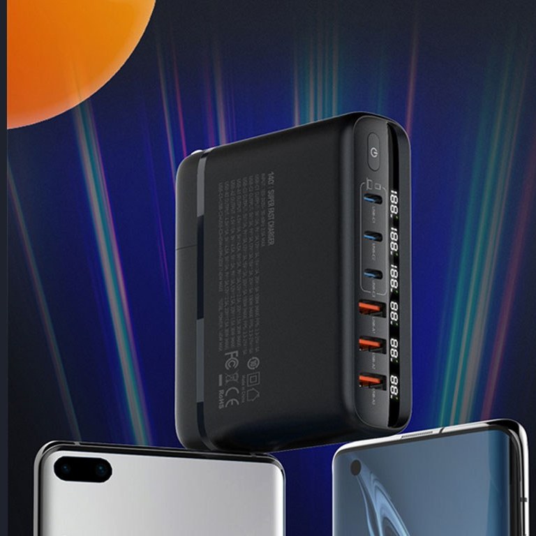 6 درگاه خروجی ؛ 3 درگاه PD و 3 درگاه USB توان کلی خروجی 140 وات دارای 6 عدد LCD مجزا برای نمایش اطلاعات شارژ تکنولوژی GaN پشتیبانی از Super Fast Charging 1 عدد کابل شارژ 2 سر تایپ سی SUPER FAST امکان اتصال کابل افزایش طول و یا 2 شاخه امکان تغییر سری های 2 شاخه و 3 شاخه خروجی تا 5 آمپر قابلیت شارژ همزمان 6 دستگاه AutoID ، تخصیص هوشمند شدت جریان خروجی