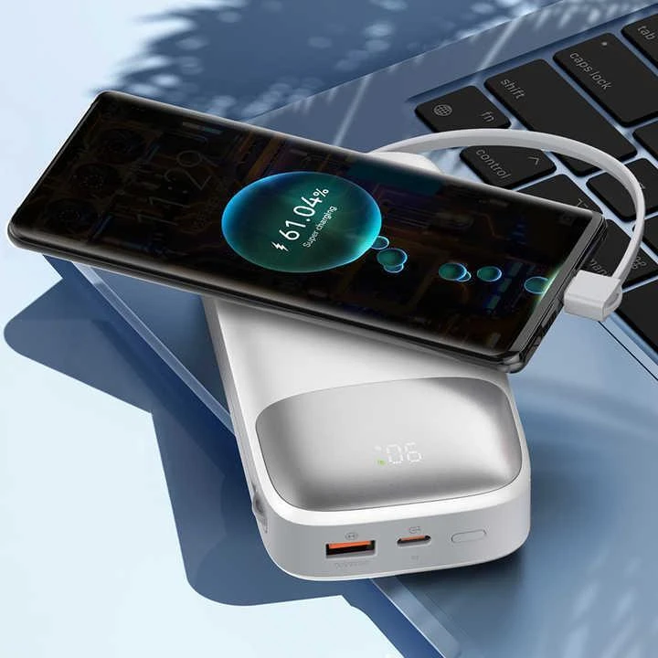 Super Fast Charge 2 درگاهکابل متصل به بدنه ؛ Lightning و Type-C خروجی 22.5 وات دارای نمایگر LCD میزان شارژ پاوربانک از طریق درگاه Type-C به صورت FAST شارژ می شود حداکثر شدت جریان خروجی 4.5 آمپر حداکثر شدت جریان ورودی 3 آمپر AutoID؛ تخصیص هوشمند شدت جریان نمایشگر LCD میزان شارژ َAuto Power مجهز به استانداردهای روز دنیا طراحی بی نظیر ابعاد کوچک کیفیت ساخت فوق العاده